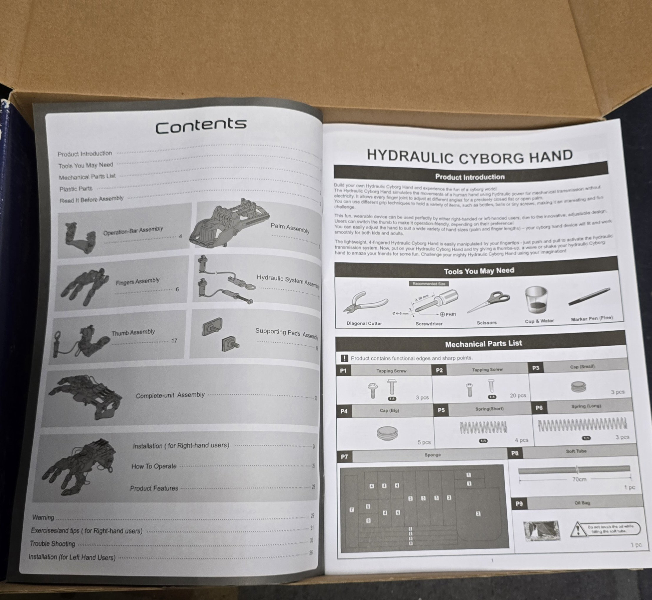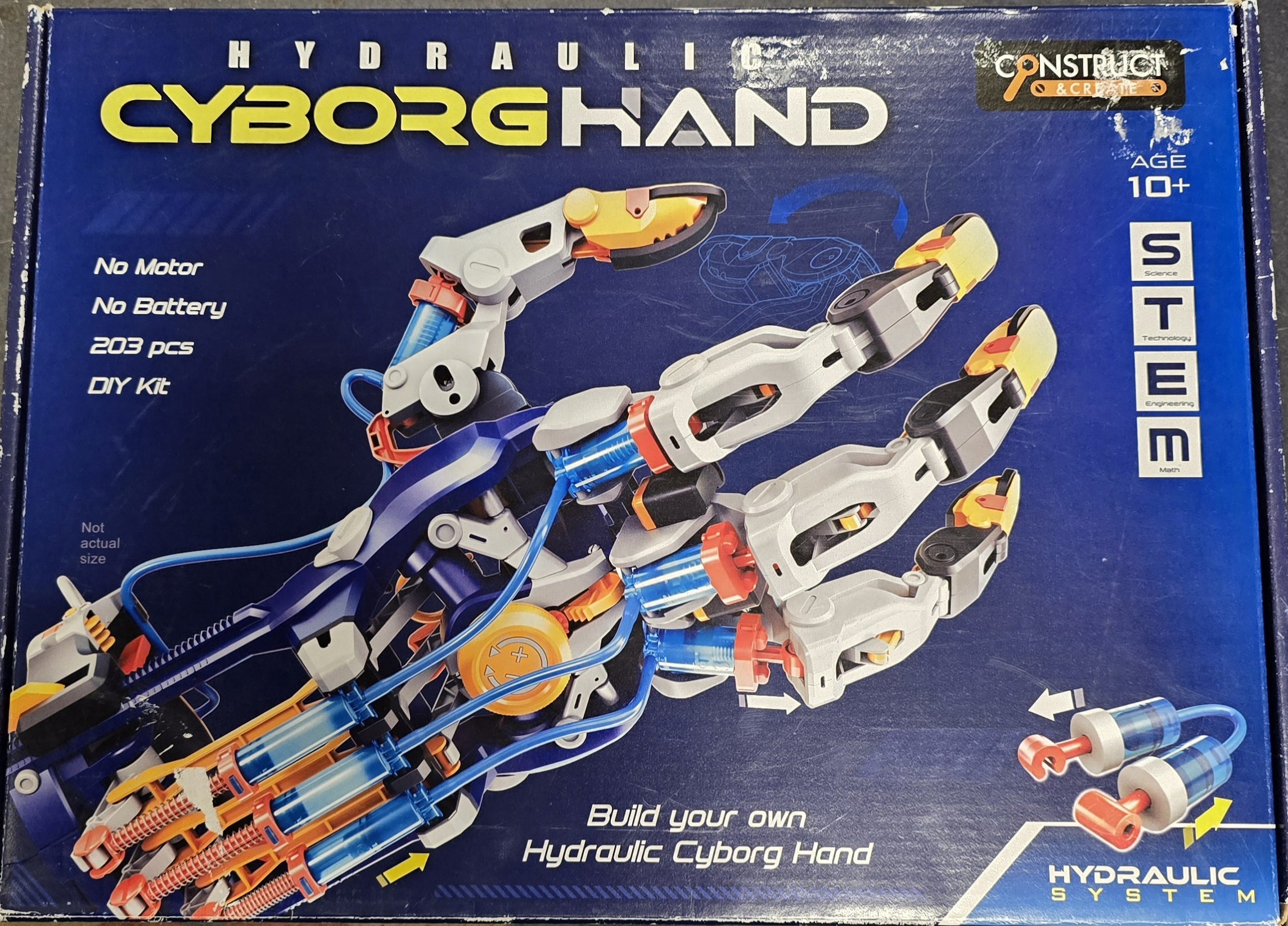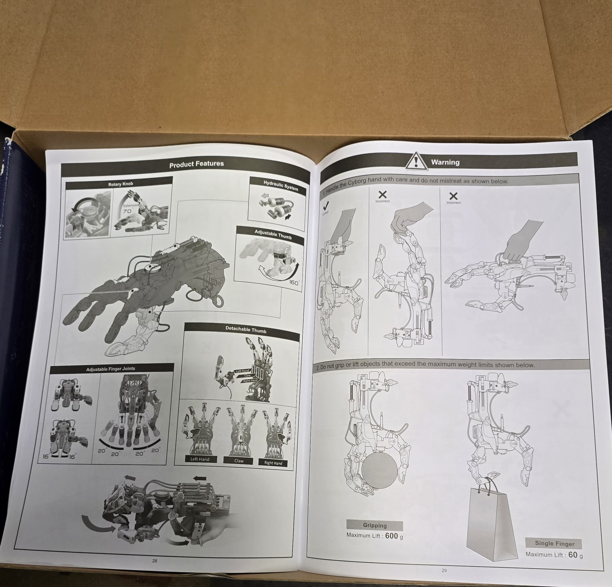 The lightweight, 4-fingered Hydraulic Cyborg Hand is easily manipulated by your fingertips – just push and pull to activate the hydraulic transmission system. Now, put on your Hydraulic Cyborg Hand and try giving a thumbs-up, a wave or shake your hydraulic Cyborg hand to amaze your friends for some fun Challenge your mighty Hydraulic Cyborg Hand using your imagination!